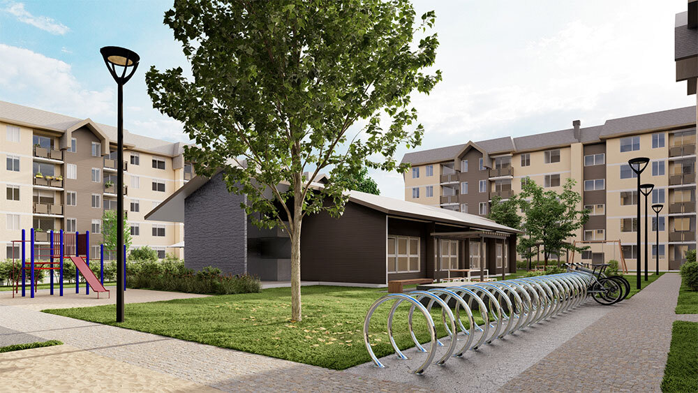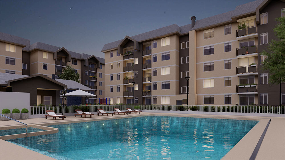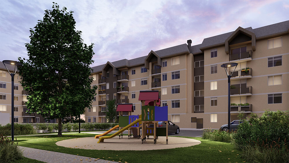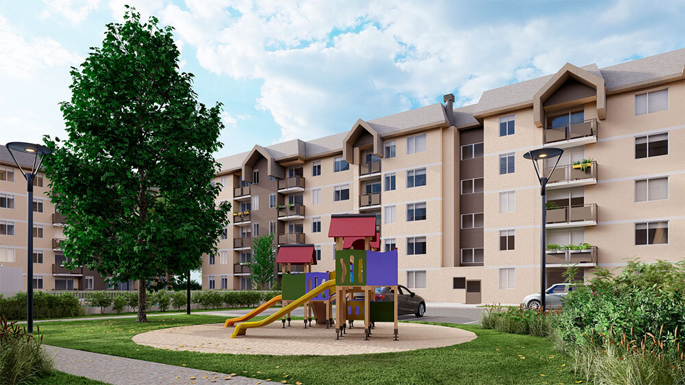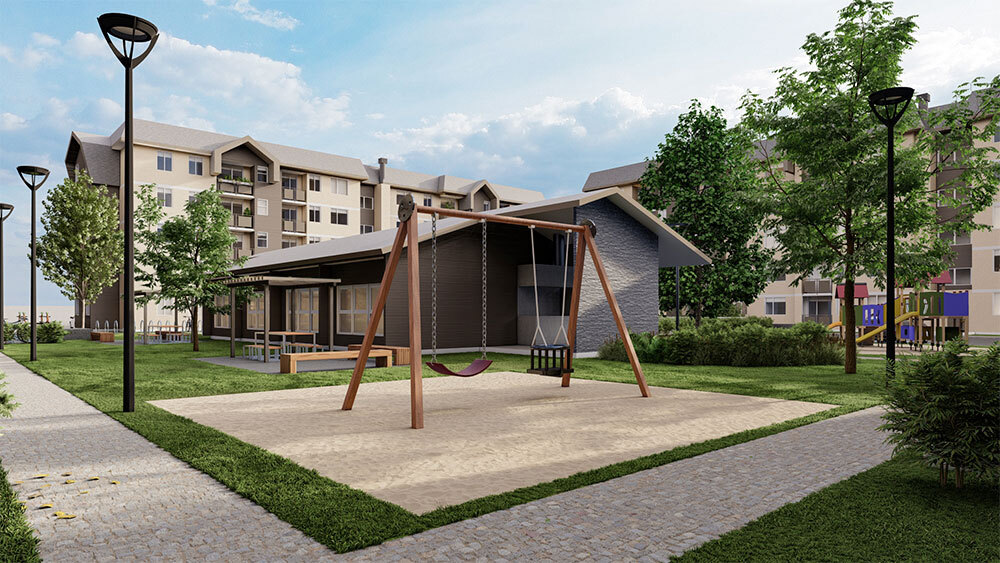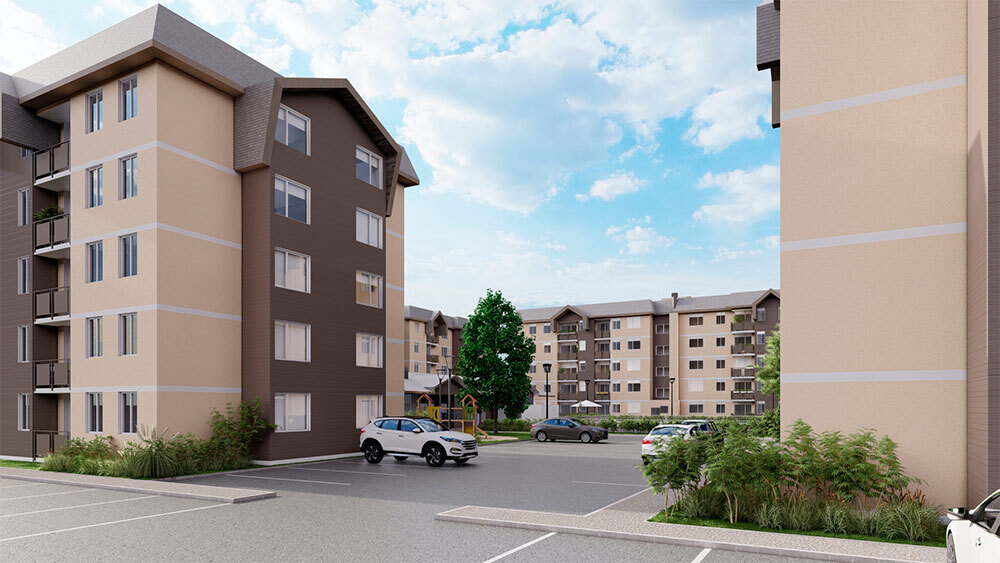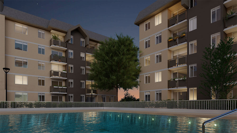 Cuenta con 4 torres de 5 pisos cada una, de tal forma de dejar un gran área verde central, la cual contiene, equipamiento de alto estándar, juegos infantiles, 4 salones gourmet, 2 pérgolas con parrilla y una piscina. El condominio se venderá en 2 etapas. Actualmente está a la venta la primera etapa, que considera 2 edificios.
